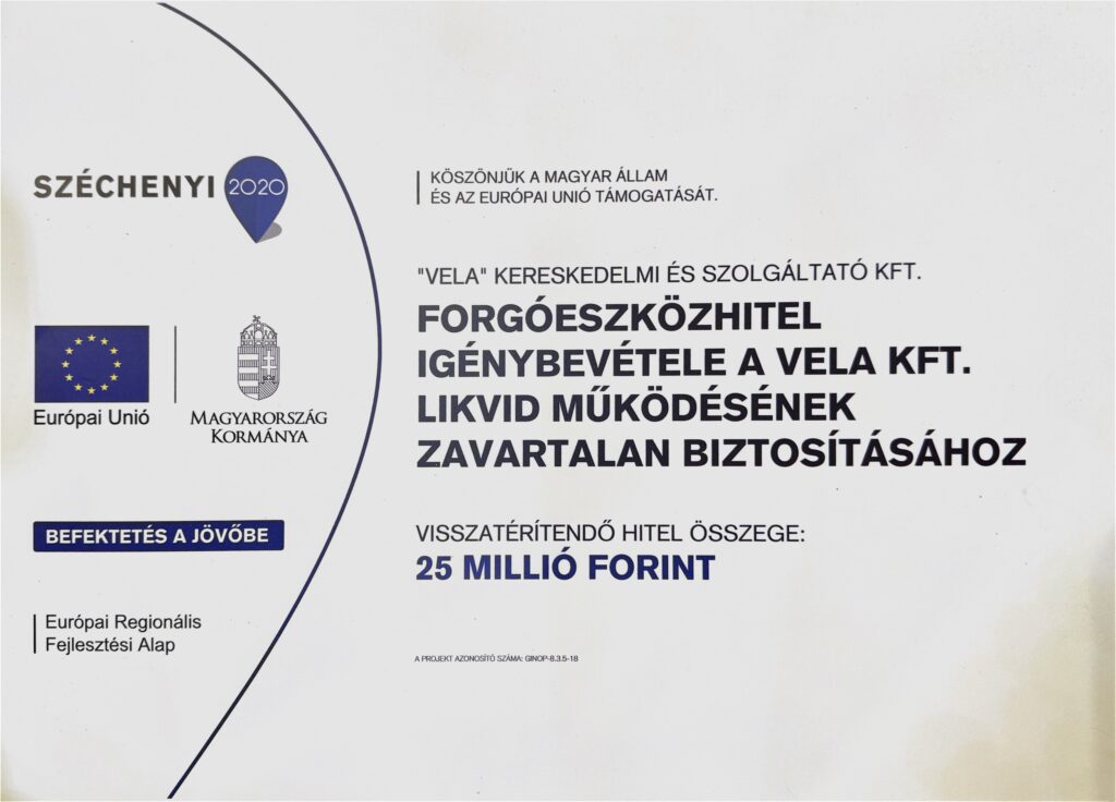 Magyarország Közös Agrárpolitika Stratégiai Tervének keretében a Feldolgozó üzemek fejlesztésének támogatása című felhívás pályázatával vállalkozásfejlesztés valósul meg a VELA Kft. versenyképességének növelése érdekében. A fejlesztéshez több mint 27 millió forint vissza nem térítendő támogatás nyújt segítséget az Európai Mezőgazdasági Vidékfejlesztési Alap és Magyarország költségvetése társfinanszírozásban.